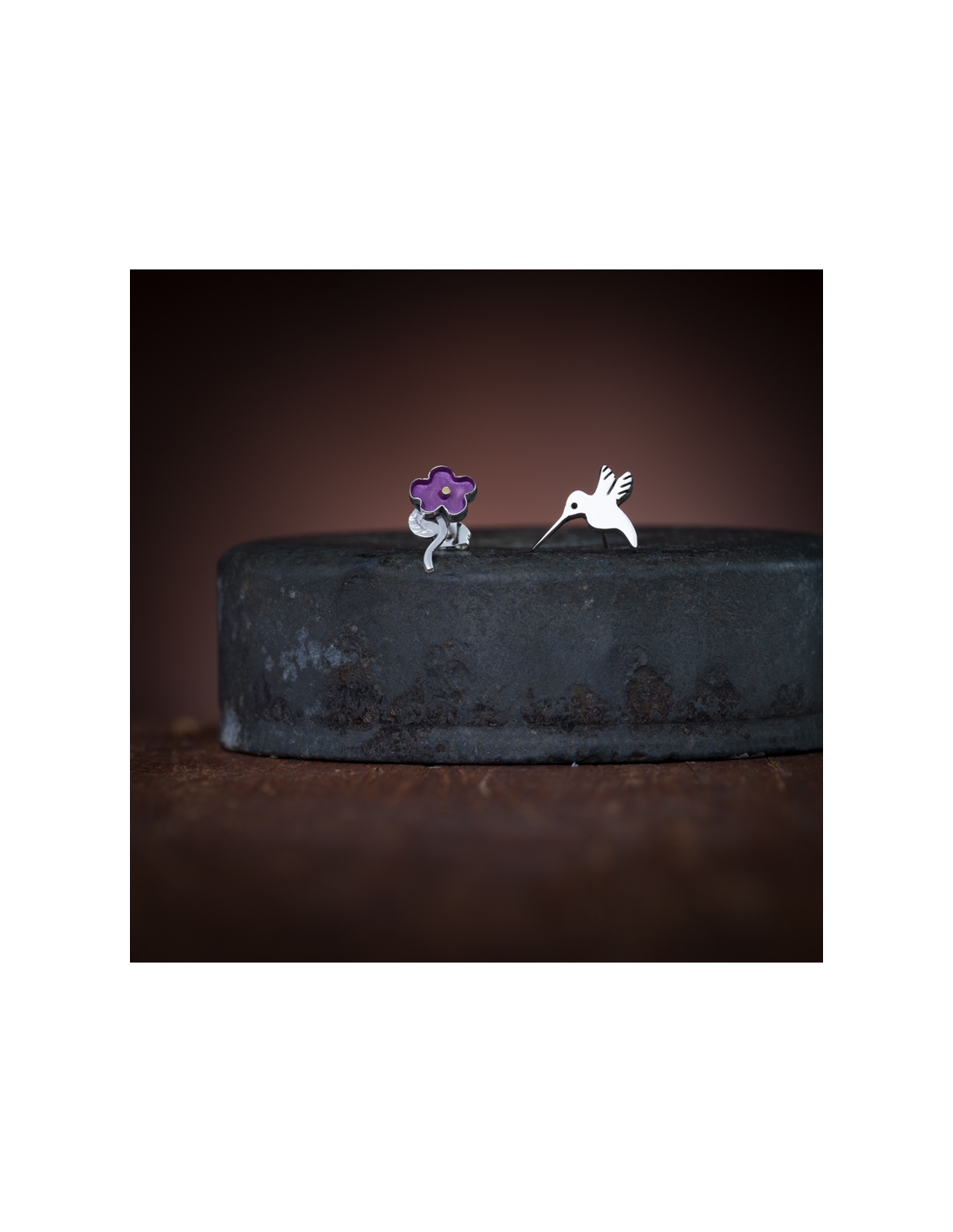 Aretes de plata .925 cartoneado colibrí y flor con resina