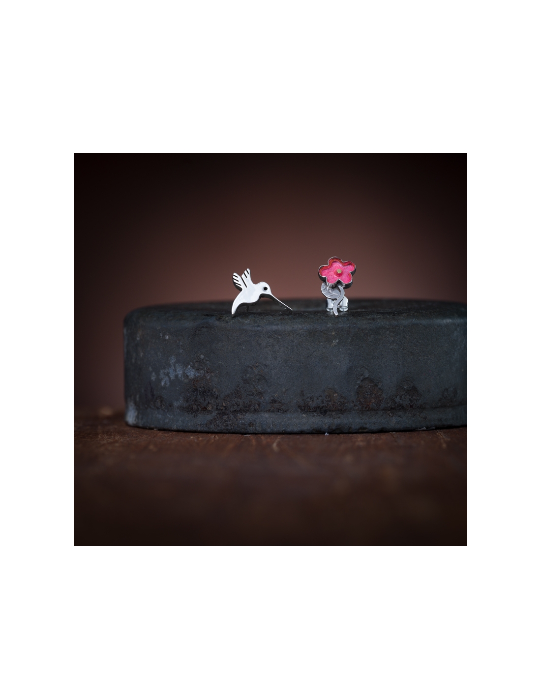Aretes de plata .925 cartoneado colibrí y flor con resina