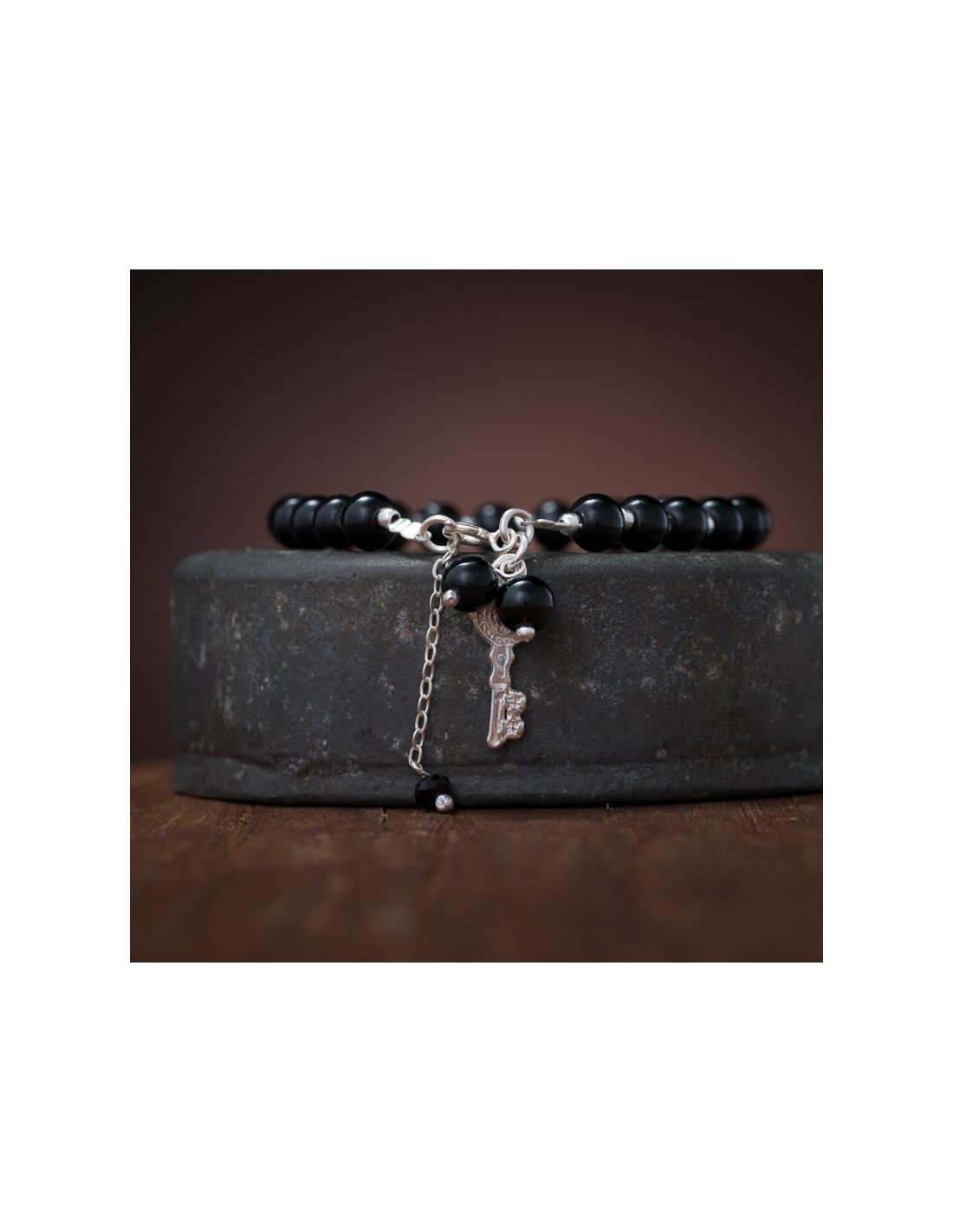 Pulseras de plata .925 con piedra ónix, bolitas lisas y dije corazón llave de san Benito