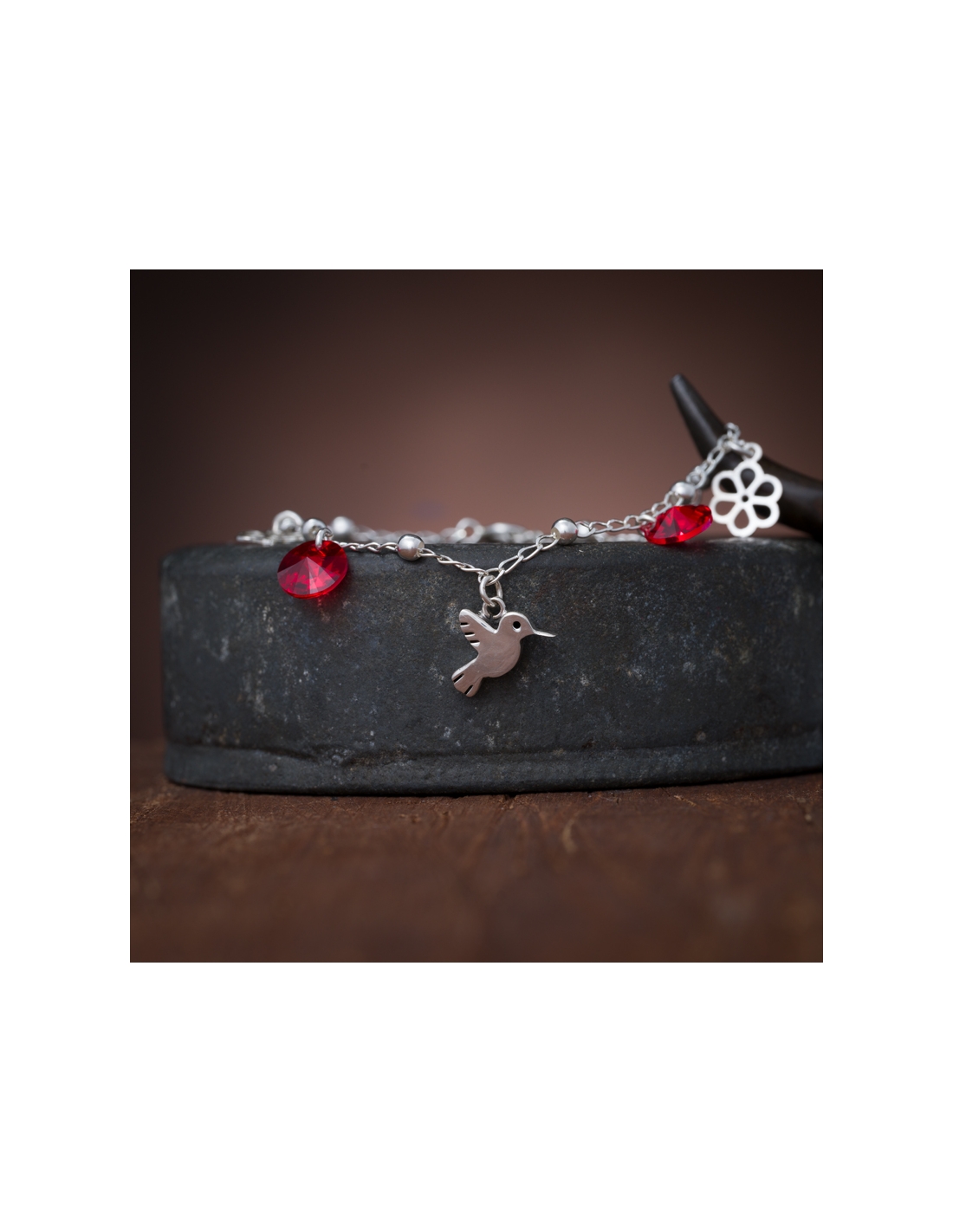 Pulsera de plata .925 "Cristales y dijes colgantes de flores y colibrí"