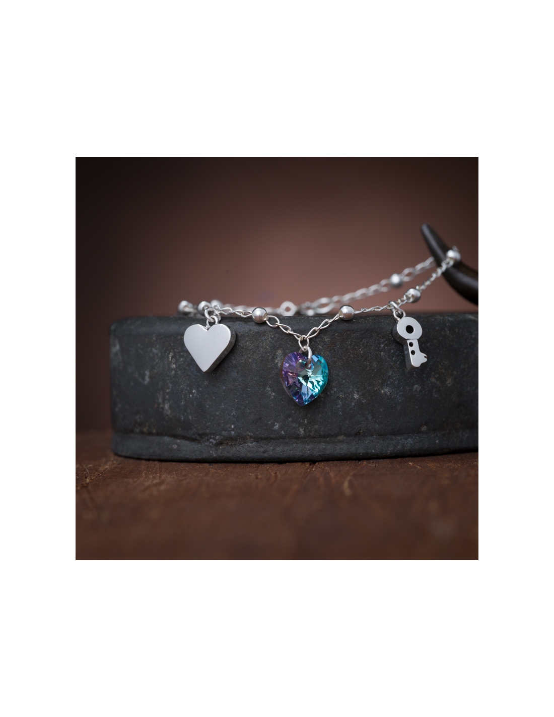Pulsera de plata .925 "Cristal y dijes colgantes de corazón y llave"
