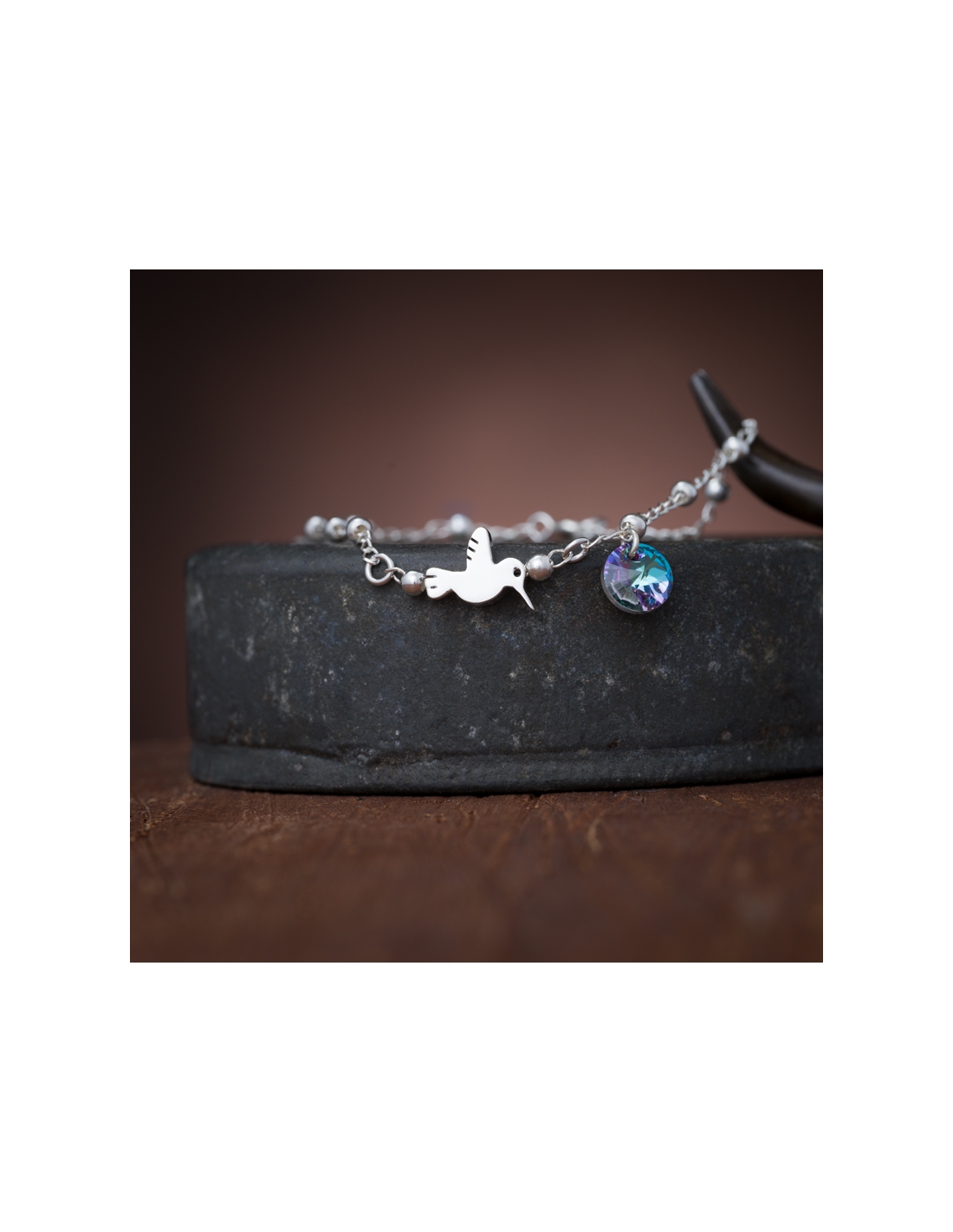 Pulsera de plata .925 "Cristal y dije de colibrí"