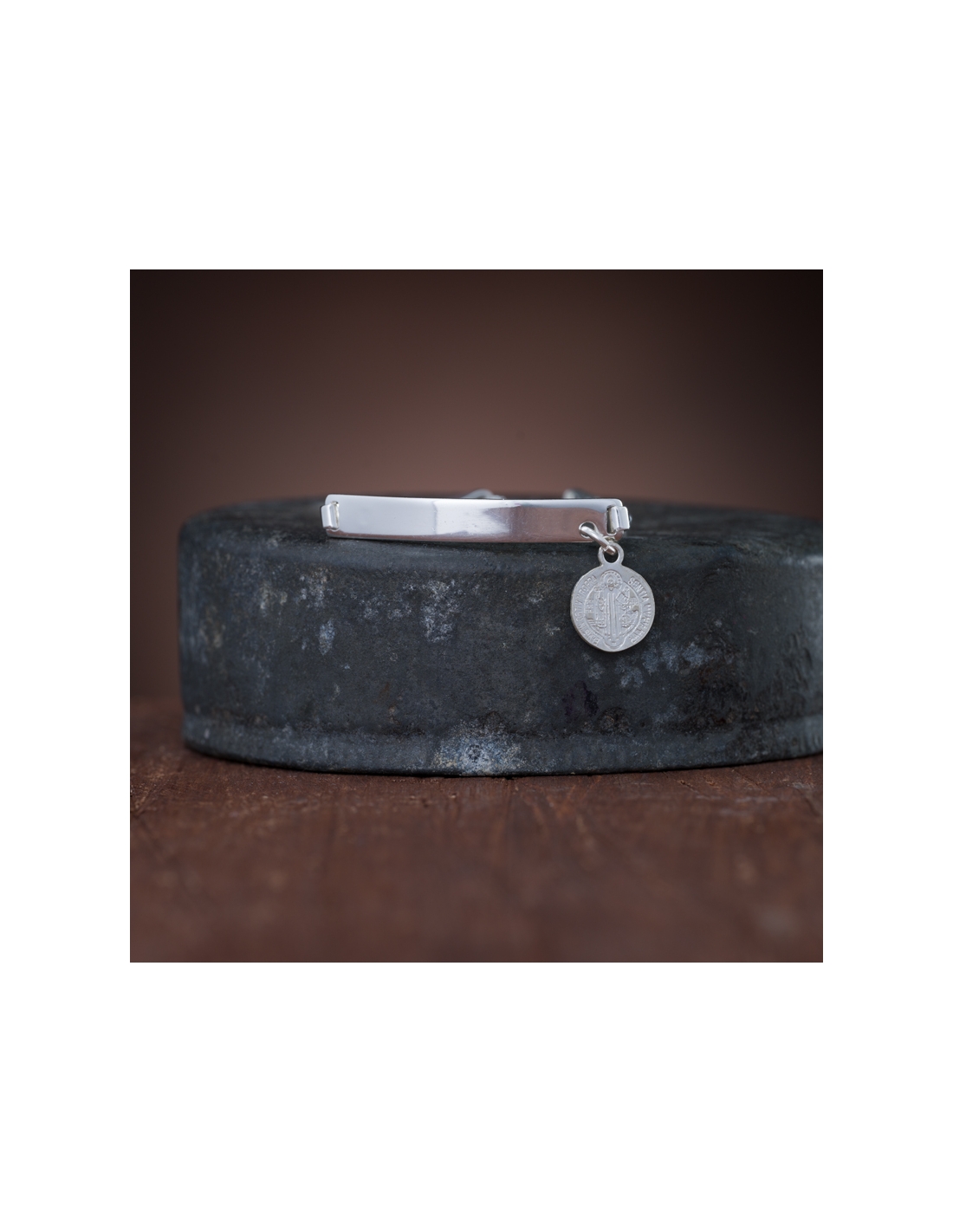 Esclavas de plata .925 cartier con plaquita lisa, dije medalla de san Benito, medida 14 cm