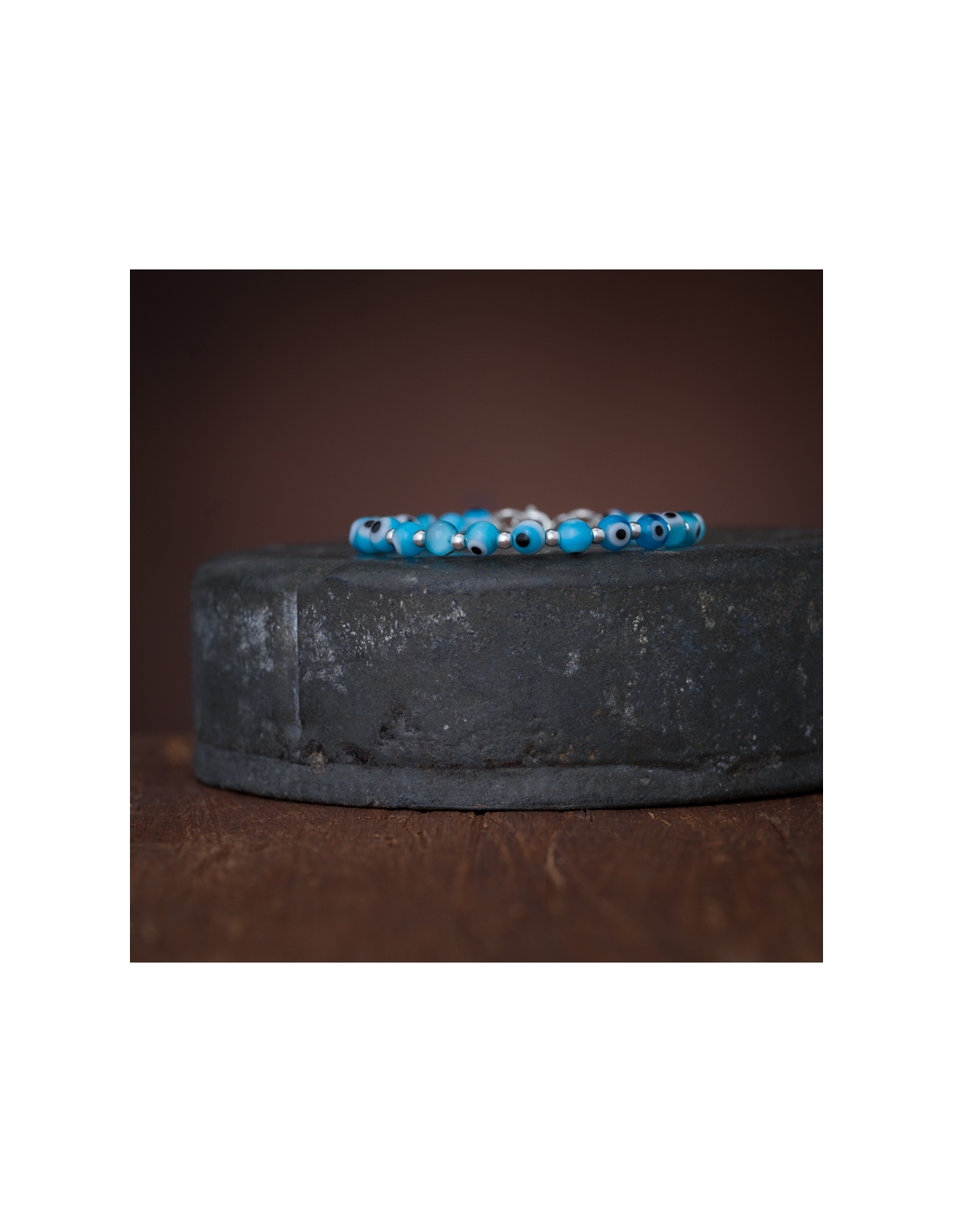 Pulseras de plata 9.25 para bebé con ojitos en color azul y bolitas de plata de 14 cm