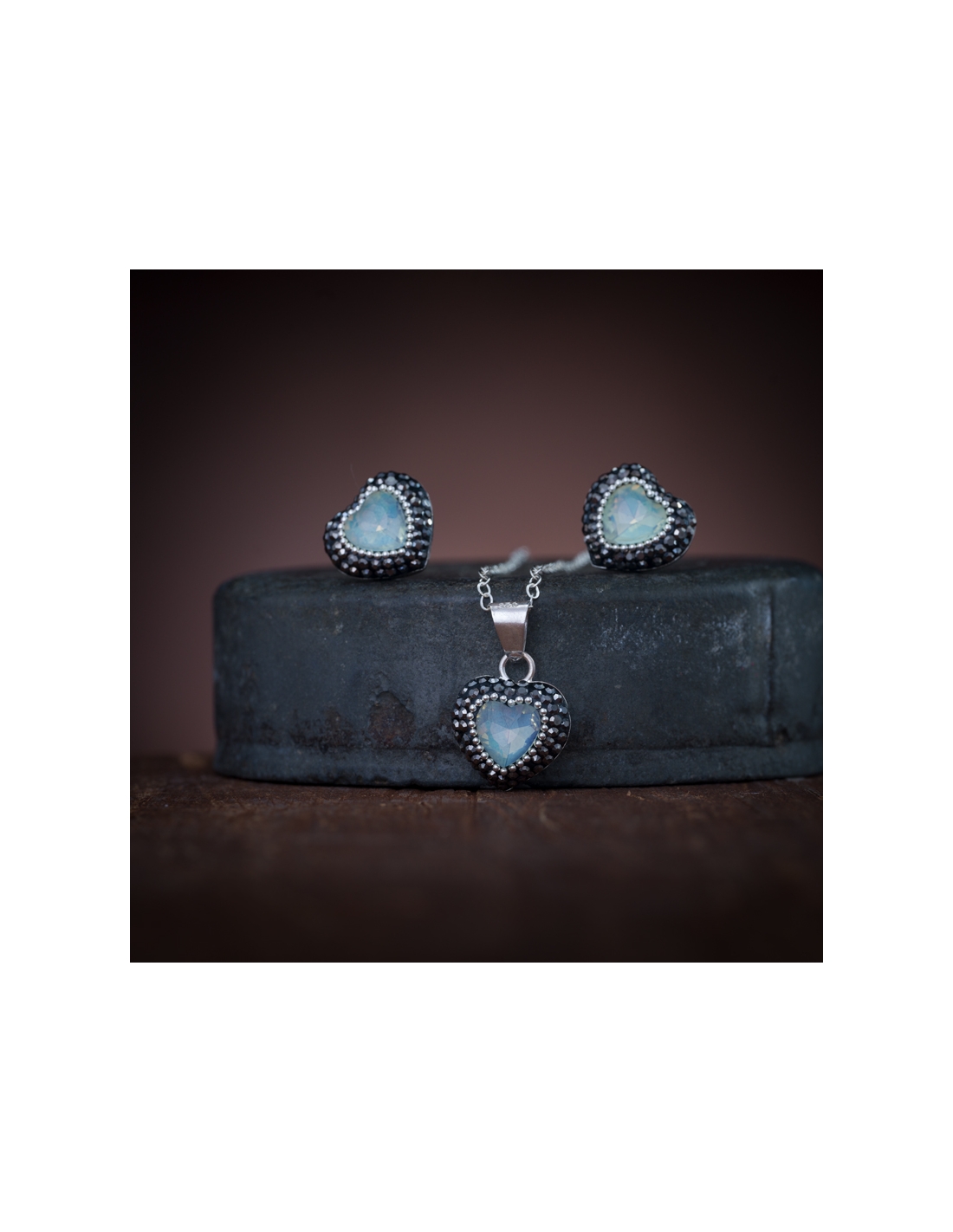 Juego aretes y collar de plata .925 corazón con cristales