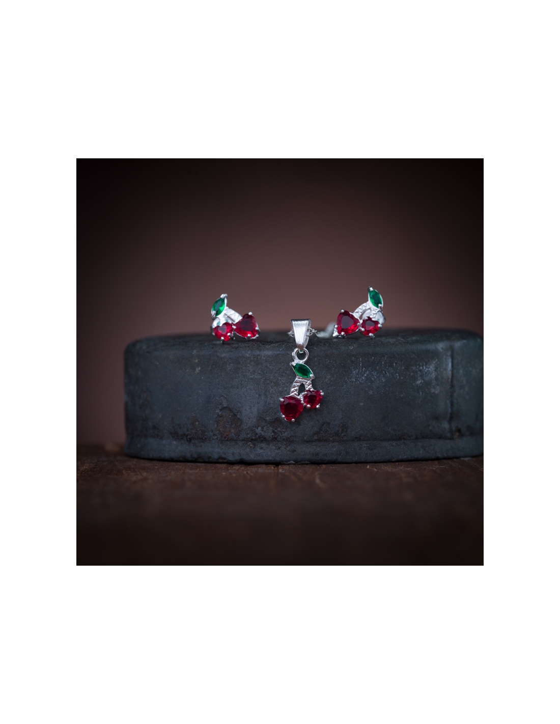 Juego aretes y collar de plata .925 cerezas con cristales