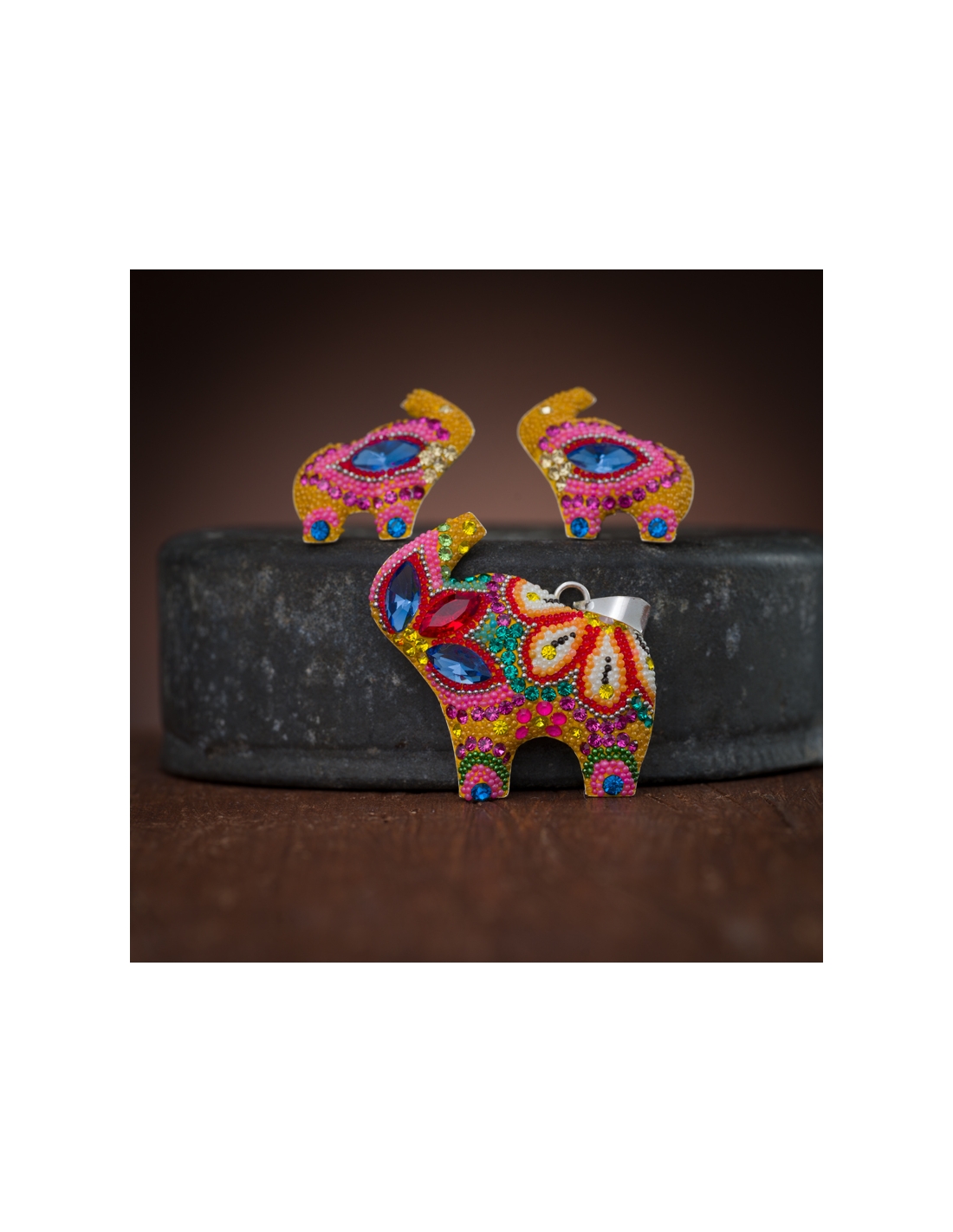 Juego de aretes y dije de plata .925 elefante con cristales y micro perlas