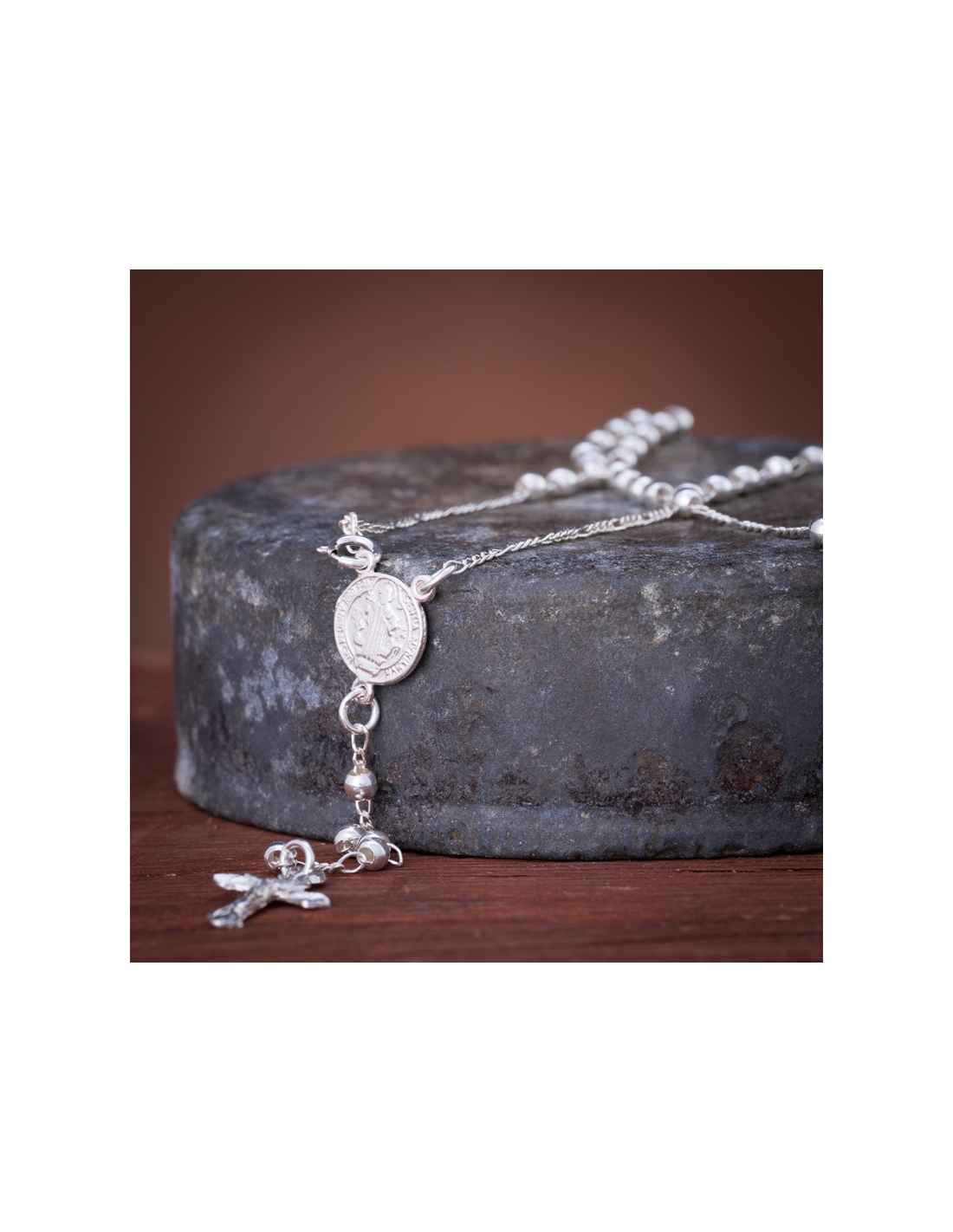 Rosarios de plata .925 con bolita lisa #3 medalla de San Benito, 50 cm de largo